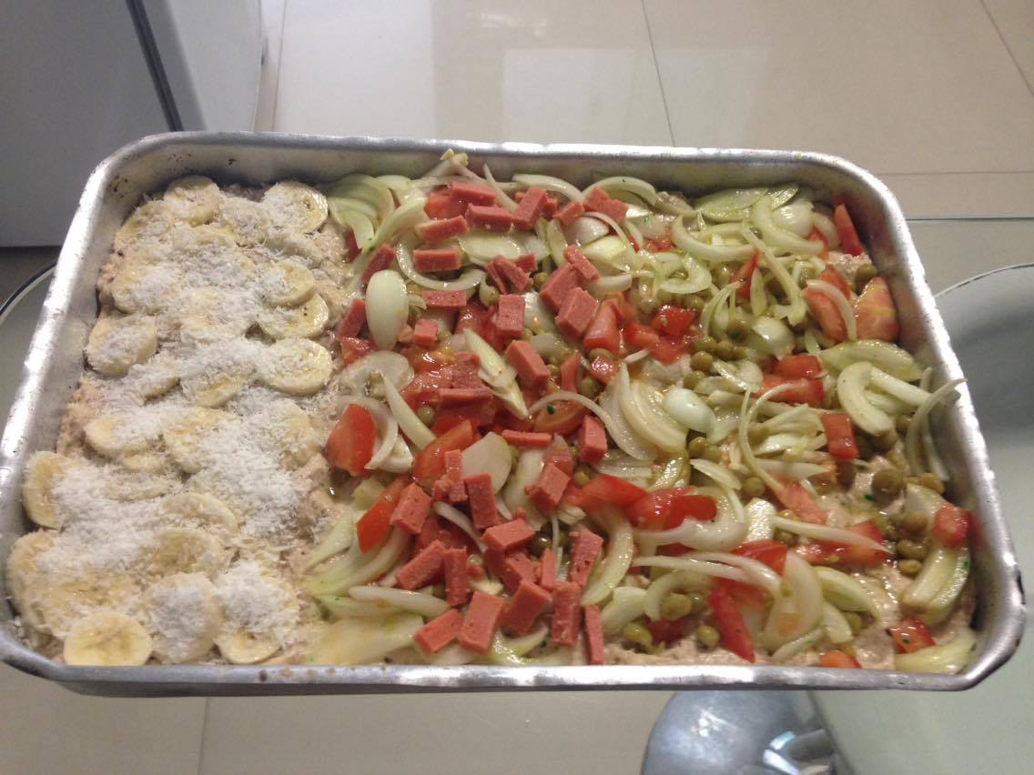 cobertura opcional (usei cebola, tomate, ervilha e glutadela para a parte salgada, e banana com coco ralado para a parte doce.